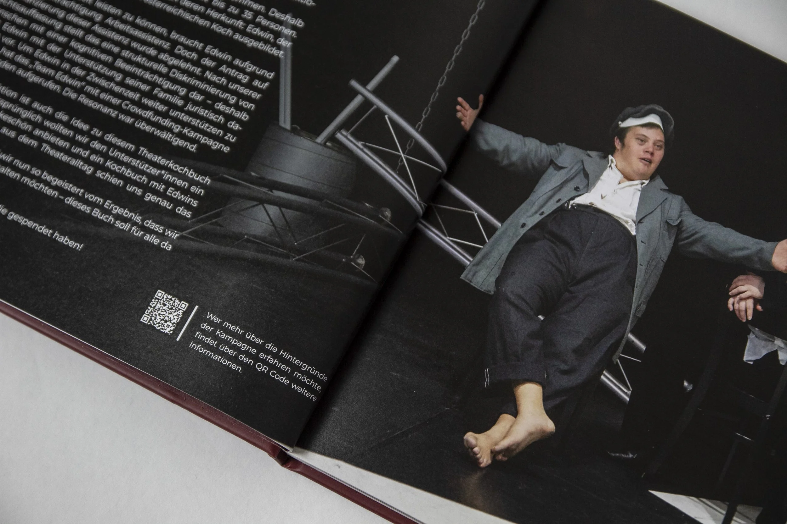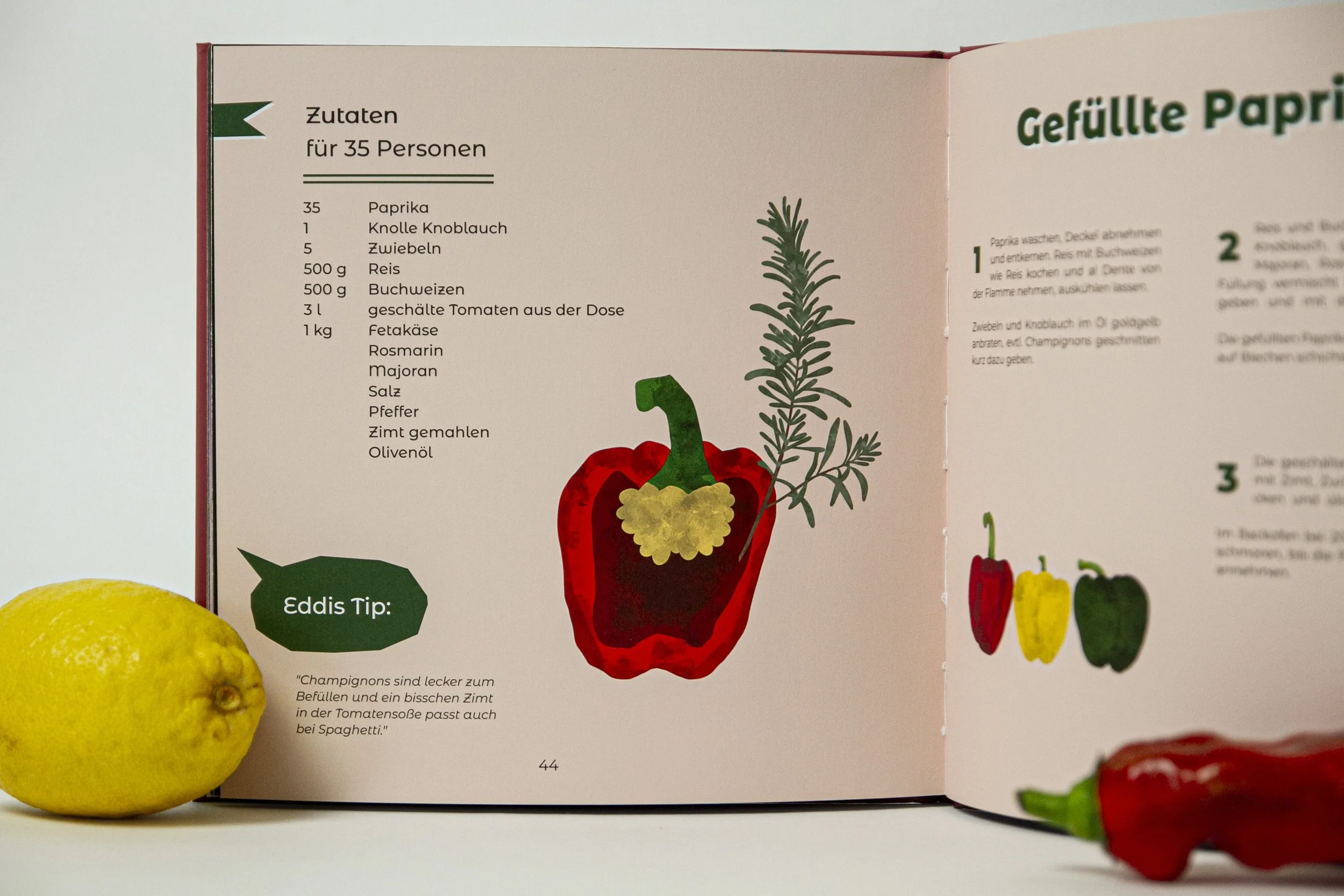 Habt ihr schon einmal von einem Theaterkoch gehört? Edwin Engeser ist Koch für das Theater in Lörrach. Gemeinsam mit ihm, seiner Familie und dem Theater Tempus Fugit in Lörrach durfte ich ein Kochbuch gestalten und illustrieren. Es besteht aus Rezepten von ihrem ganz persönlichen Koch, der dort mit Assistenz für Aufführungen, Proben und Aktionstage kocht. All diese Rezepte sind - natürlich, wie soll es auch anders sein - in großen Mengenangaben, damit die nächste Gruppenkochaktion gesichert ist. Das Buch gibt neben den Rezepten außerdem Einblicke in die Aufführungen, die durch grandiose Fotos unterschiedlicher Fotograf:innen ergänzt wurden. Es erzählt außerdem die ganz persönliche Geschichte von Edwin, der Down-Syndrom hat und mit seiner Familie seit einigen Jahren darum kämpft seine Arbeitsassistenz für diesen Beruf finanziert zu bekommen.